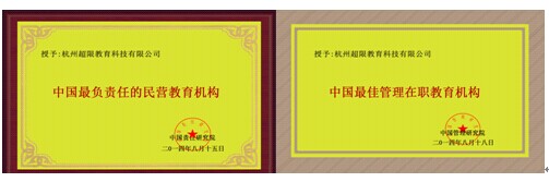 杭州超限教育中心分别获得了浙江大学、厦门大学、西南大学、西北大学、澳大利亚墨尔本大学“最佳年度合作伙伴”称号,获得了由中国管理研究院颁发的“中国优秀管理企业”称号,由中国责任研究院颁发的“中国最负责任的企业”称号。