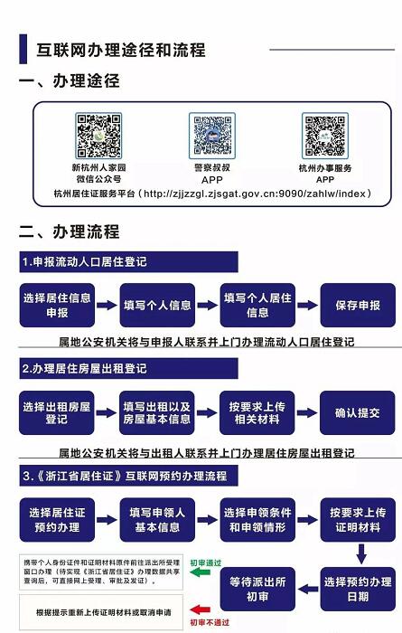 (四)发放。受理窗口领取或邮政快递寄送。通过“杭州市居住证服务平台”居住证预约受理模块填写个人基本信息,上传居住证申领相关证明材料后,根据个人安排预约办证时间。经公安机关初审通过后,流动人口可以携带相关证明材料原件前往指定受理点办理居住证。