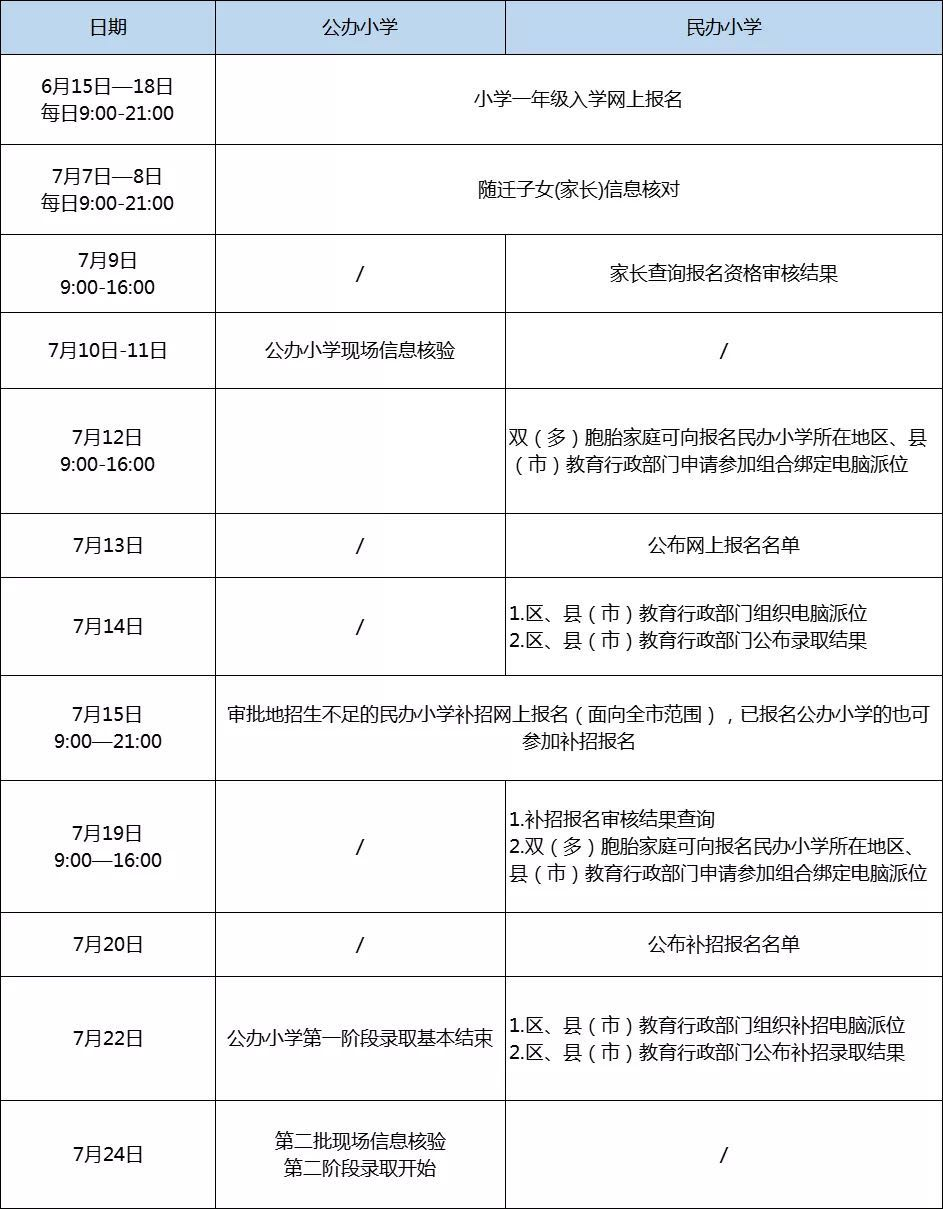 完成公办小学网上报名且符合上城区小学一年级入学条件的适龄儿童,于7月10日—11日进行第一批现场信息核验;网上报名民办小学但未被录取且符合上城区小学一年级入学条件的适龄儿童,于7月24日进行第二批现场信息核验。