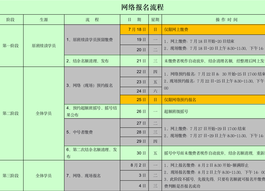 5、缴费时限:原班预留、摇号中号者,必须在规定时间内缴费,超出时间未缴费的视作自动放弃,班级名额重新在网上发布。