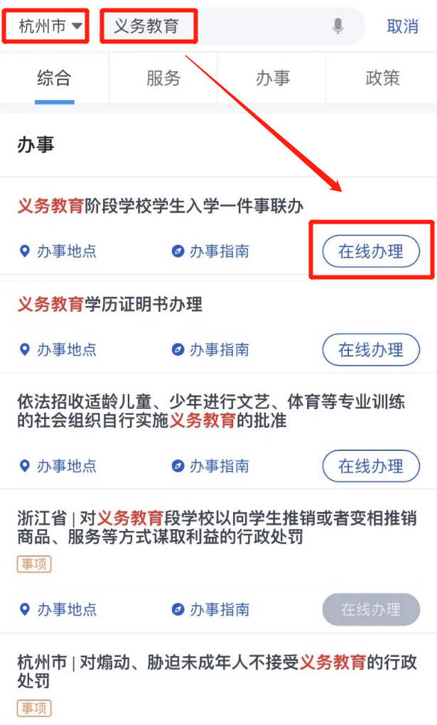 手机打开“浙里办”APP,输入“义务教育”关键词搜索——地区选择“浙江省-杭州市-**区”——进入“义务教育阶段学校学生入学一件事联办”,点击“在线办理”——进入杭州市义务教育入学报名服务。