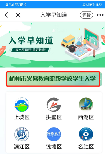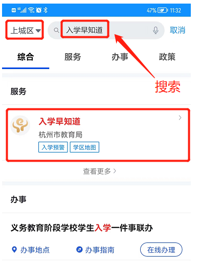 也可输入“入学早知道”关键词搜索——进入“入学早知道”——点击“杭州市义务教育阶段学校学生入学”——进入杭州市义务教育入学报名服务。