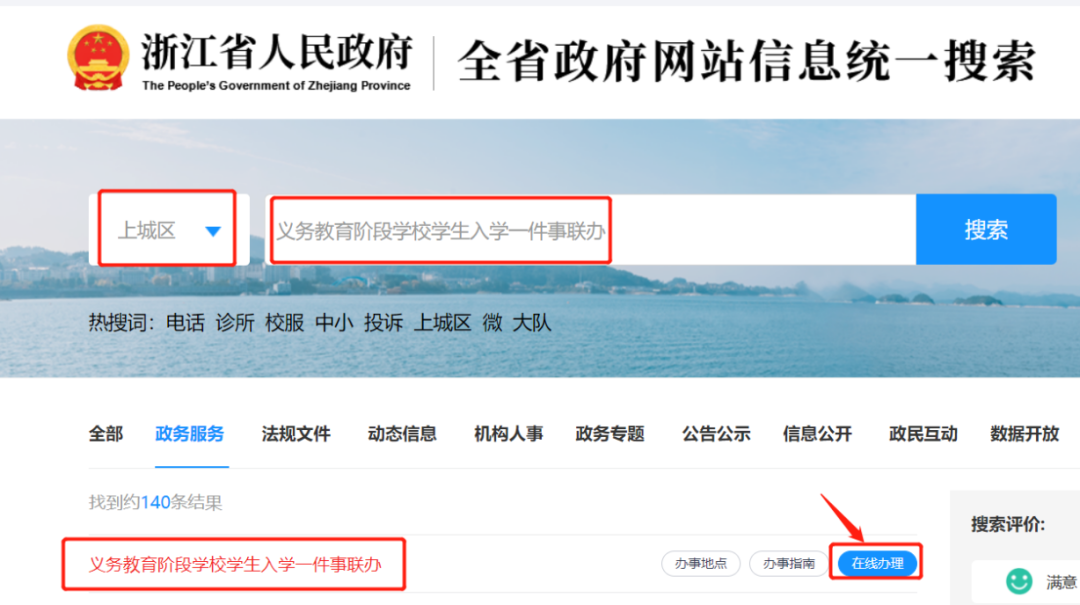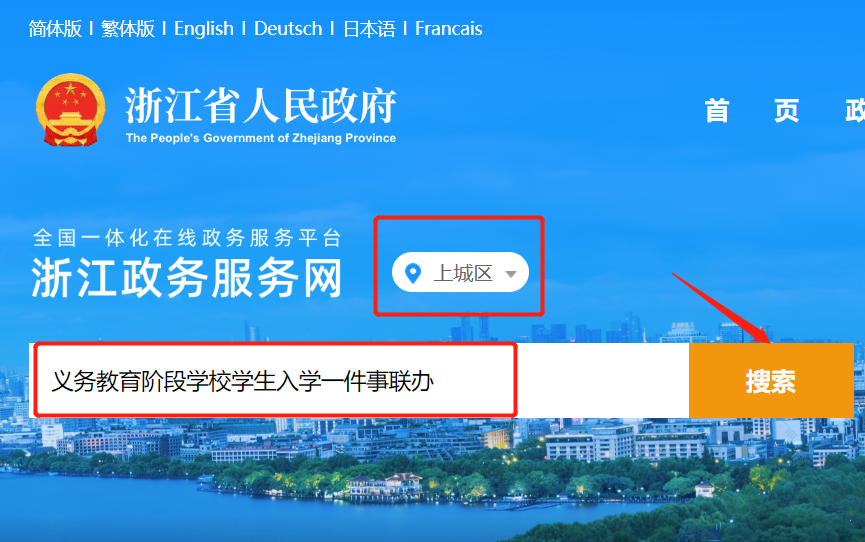 电脑网页打开浙江政务服务网(http://www.zjzwfw.gov.cn)——个人登录,输入“义务教育阶段学校学生入学一件事联办”搜索,点击“在线办理”——选择“浙江省-杭州市-**区”——进入杭州市义务教育入学报名服务