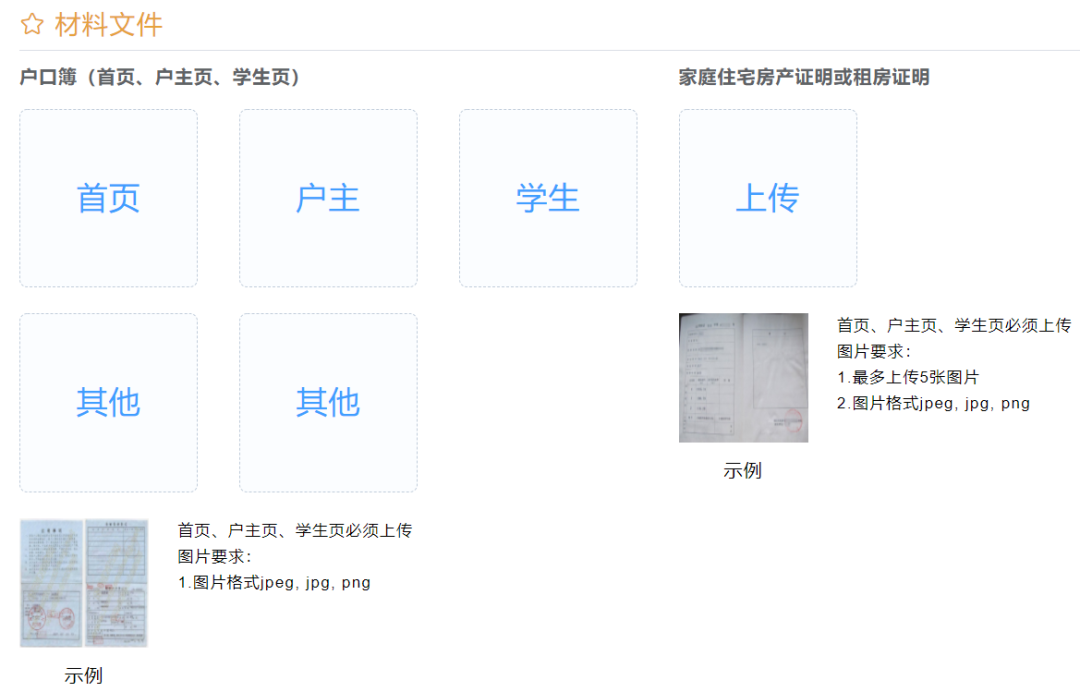 因跨区搬家迁户或跨区就读民办小学的小学毕业生,确定回户籍所在区、县(市)升学, 需要上传材料文件。