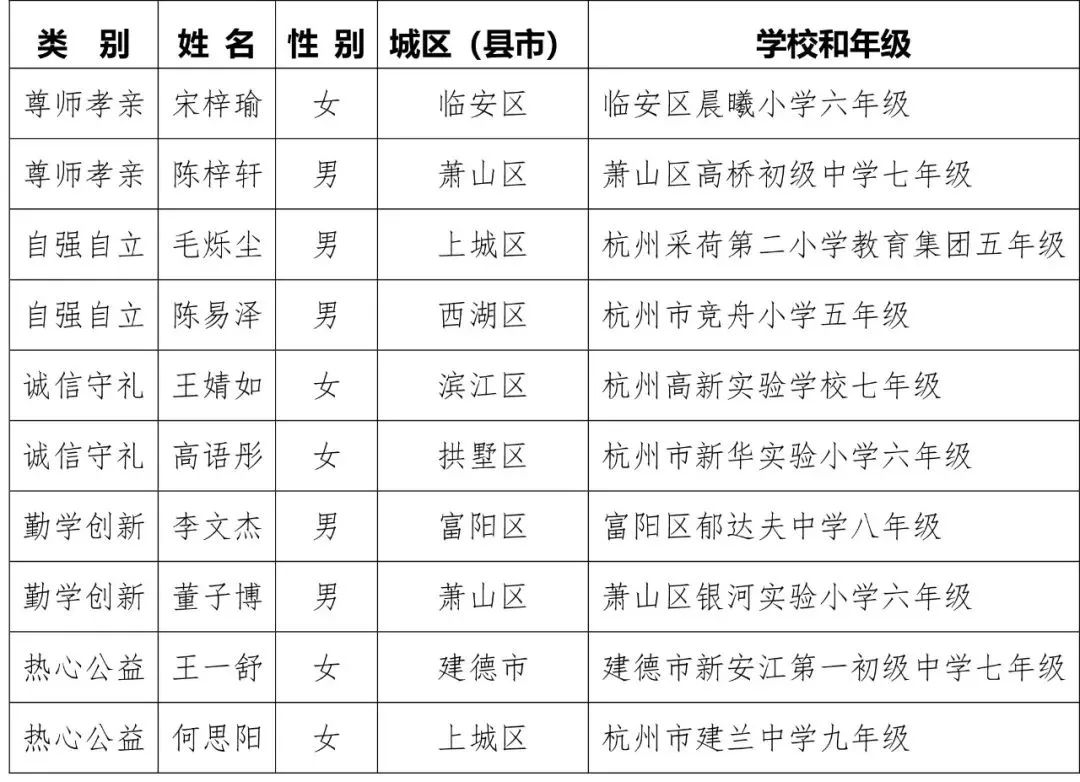 杭州市第十八届美德少年(新时代好少年)提名奖人选名单(共10名)