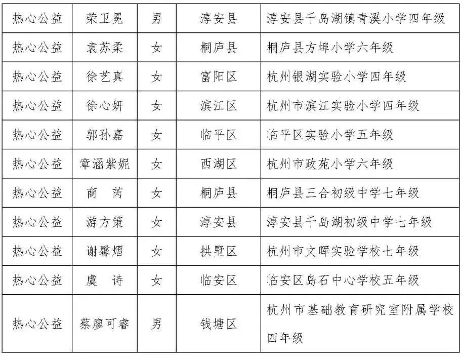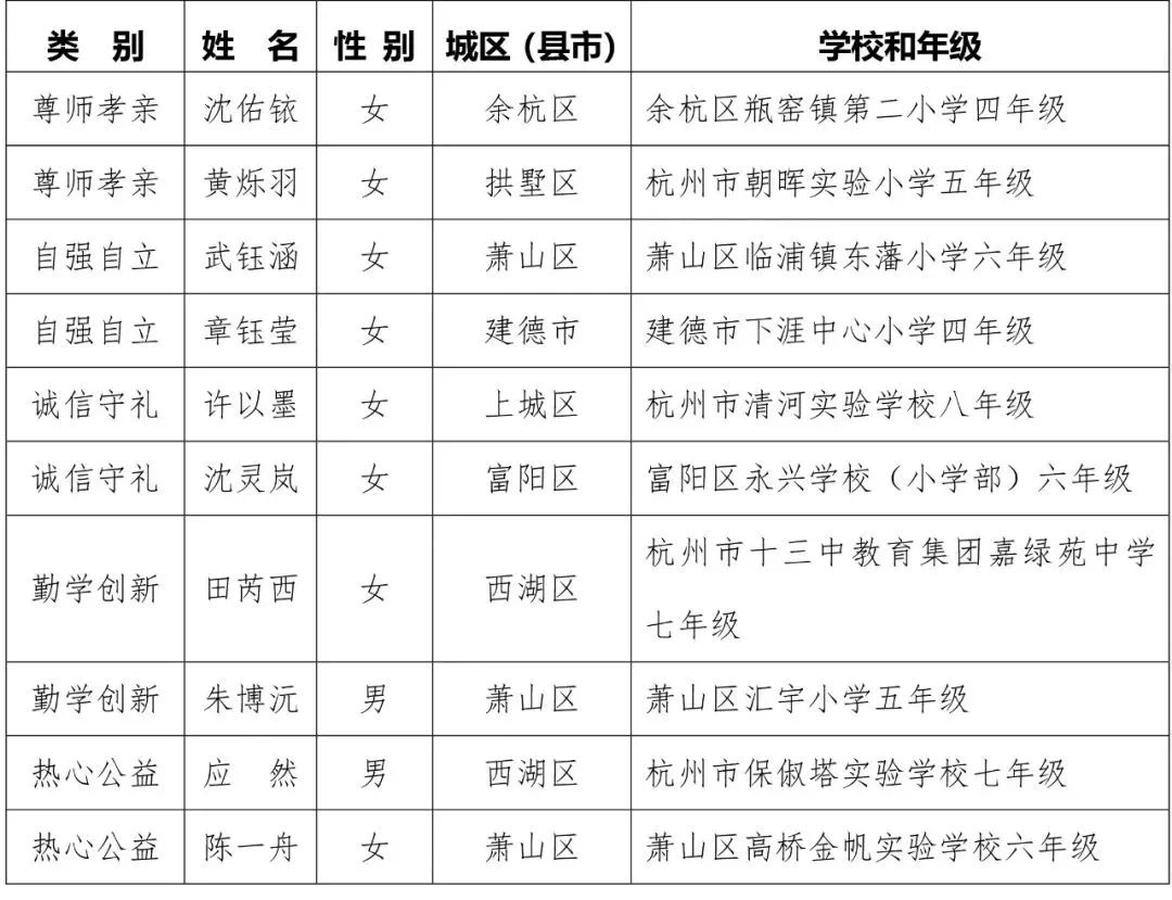 杭州市第十八届美德少年(新时代好少年)人选名单(共10名)