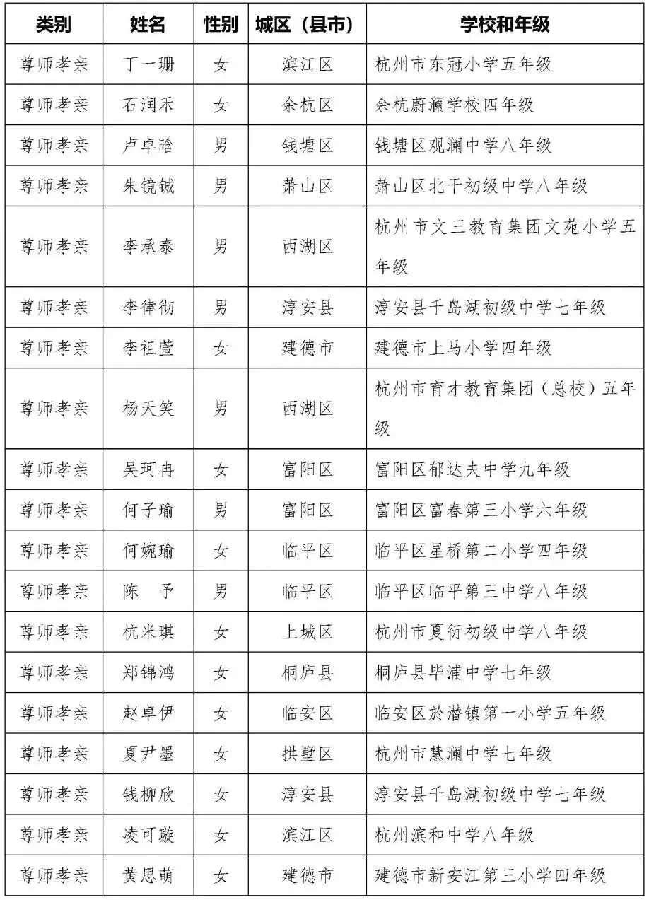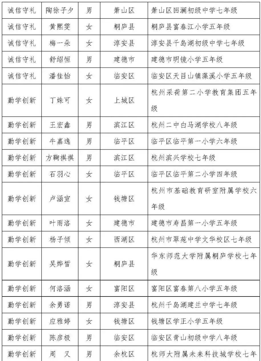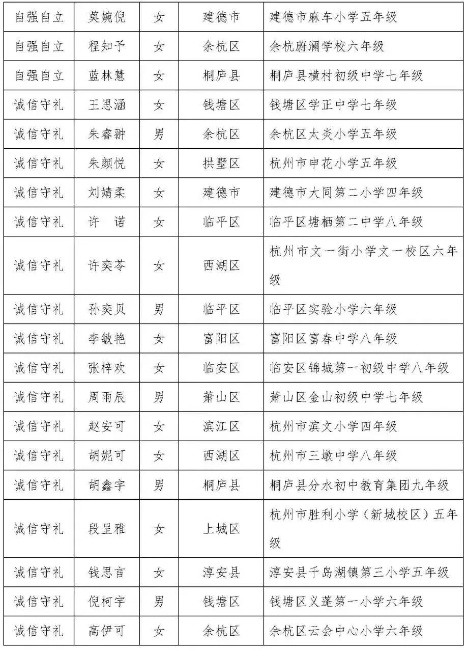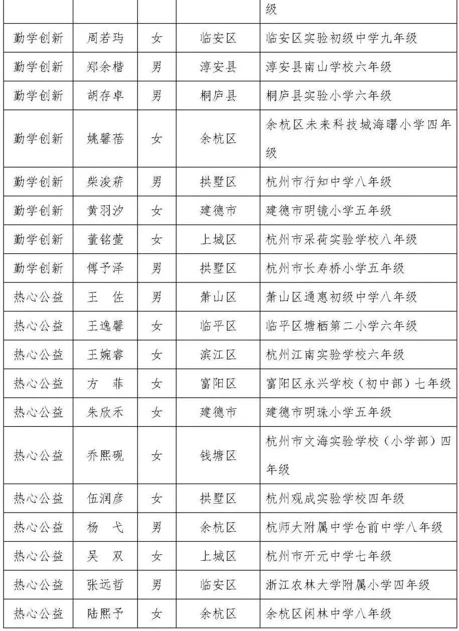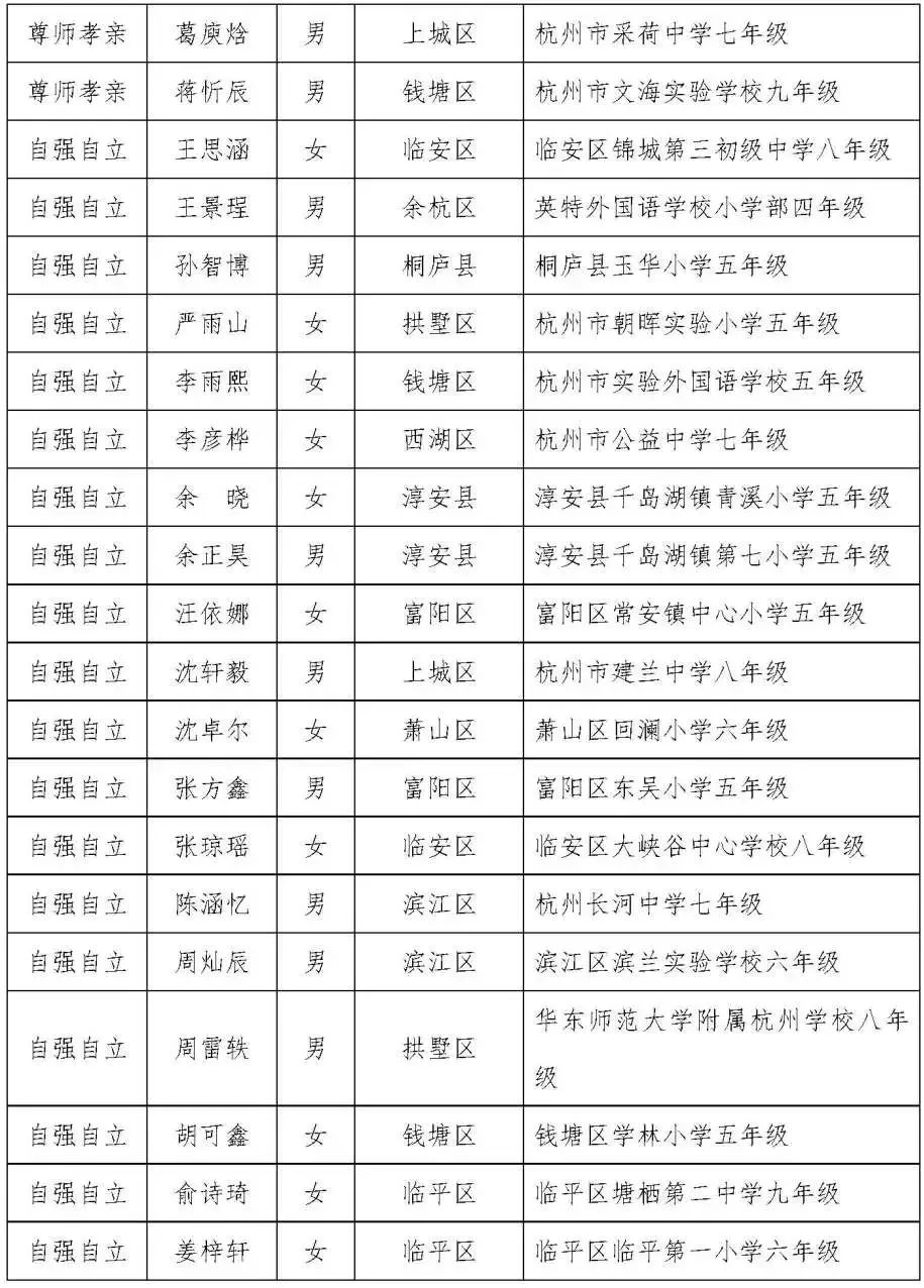 杭州市第十八届美德少年(新时代好少年)入围奖人选名单(共109名)
