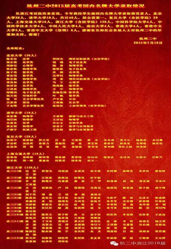 《杭州超限教育中心玛林2015年7月21日讯》上周六,从杭二中公告栏得知,2015年的高考取得不俗的成绩,领先浙江中学界。最令人瞩目和羡慕的就是国内优秀大学的录取人数。具体如下: