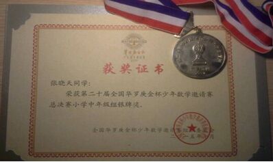 平时酷爱钻研数学的张晓天同学不负众望,夺得小学中年级组银牌。祝愿这颗数学小星星再接再厉,取得更好的成绩!