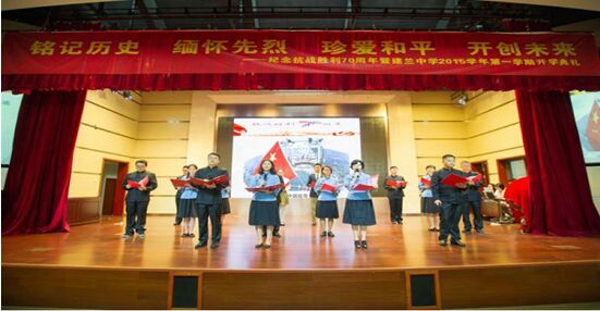 随着主持人张老师的话锋突转,我们进入了开学典礼的重要篇章——值此中国人民抗日战争胜利暨世界反法西斯胜利70周年之际,由建兰中学的教师代表为大家带来的杭州市建兰中学纪念抗战胜利70周年的主题展示——“抗战烽火,光耀千秋”。同学们和老师们听的格外认真,有的学生几度落泪。