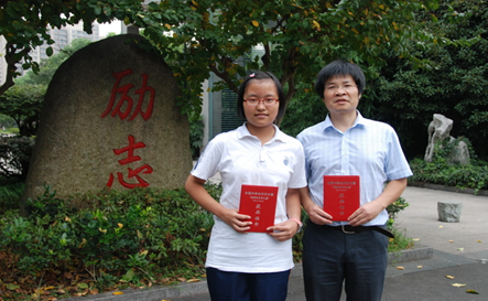 杭州文澜中学由于其优越的教学质量,培养了一代一代的新人。近日,从浙江教育报刊总社传来喜讯:文澜中学上届初三(1)班李倚霞同学荣获第十届中国中学生作文大赛二等奖、第二届“《中学生天地》杯”作文大赛省级一等奖,初三(9)班姜涵莼同学荣获第二届“《中学生天地》杯”作文大赛省级三等奖。校文学社指导教师周仁爱老师获第十届中国中学生作文大赛优秀指导教师奖。9月20日下午,就读于杭州高级中学高一年级的李倚霞同学回到母校,与姜涵莼同学和周老师在学校“励志”碑前合影留念。
