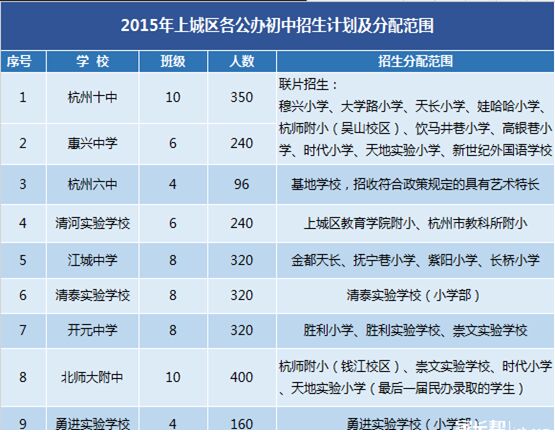 《杭州超限教育中心李林2015年12月07日讯》2016杭州小升初准备工作已经开始,作为小升初家长应提前做好准备,为孩子的未来赢得先机和保障。现就2015年杭州上城区公办初中招生计划及分配范围的情况分布一一介绍如下(在超限教育新闻陆续更新中),为2016杭州小升初各位家长提供参考。