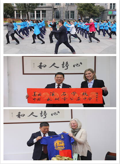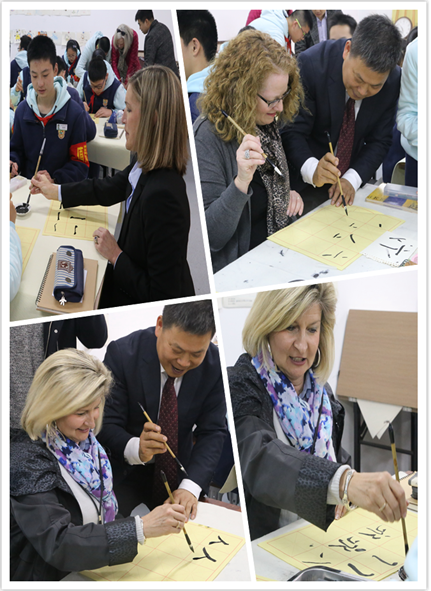 3月14日,杭州市公益中学迎来了一批远道而来的客人——来自美国德克萨斯州、弗吉尼亚州、佐治亚州的中学校长。五位美国友人一大早就和同学们共同参与了周一的升旗仪式。看着国旗在照朝阳下飘舞,公益人一天的热情似乎也逐渐开启。在几位老师的陪同下,校长们来到了北校区听一堂公益人中国特色的软笔书法课。李玉洛老师精心准备的课堂风趣生动,从汉字的历史和发展讲起,最后落实到毛笔字的书写,五位校长结合老师们准备的英文讲稿,在几位英语老师的翻译陪同下听得入了神。