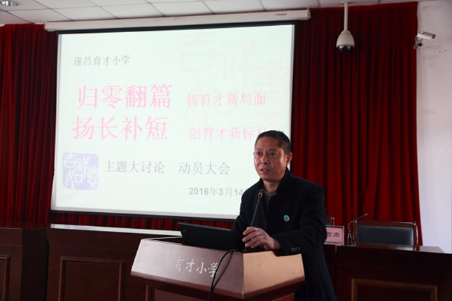 《杭州超限教育中心李林2016年3月18日讯》 3月14日晚上,育才小学全体教师集中五楼多功能教室,参加“归零翻篇,铸育才新局面;扬长补短,创育才新标杆”主题动员大会。雷新平校长主持会议并发表了重要讲话。