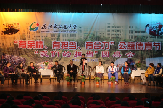 3月18日下午,本届德育节的压轴大戏 “我们的担当”四方会谈圆桌会议在大礼堂唱响,杭师大德育学博士研究生导师赵志毅教授、我校家长代表、学生代表和老师代表和全校师生共同参与,特邀杭州少儿频道的主持人华芳担当主持。