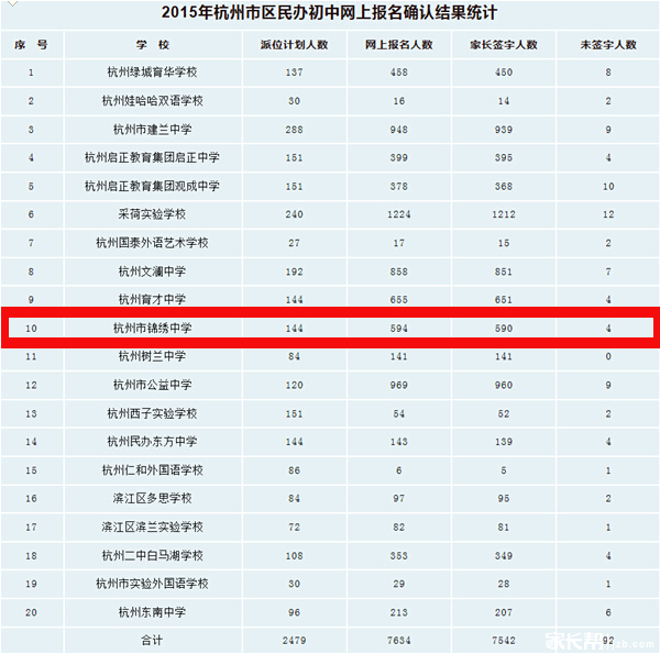 2015年杭州市区民办初中网上报名确认结果统计