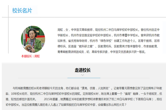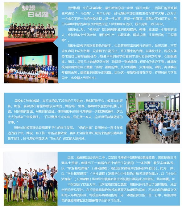 《杭州超限教育中心李林2016年05月03日讯》杭二白马湖初中部近几年来,在民办教育行列积极向前发展,取得了良好的成就。近日微访周虹这样发展教育: