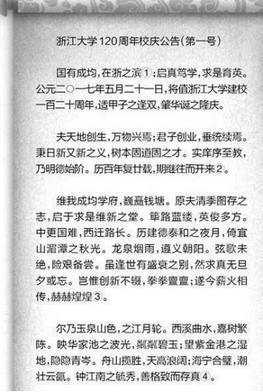《杭州超限教育中心李林2016年05月23日讯》 昨天,浙江大学师生的朋友圈被一篇“雄文”刷屏了。这篇文章通篇文言文,是浙大发布的120周年校庆第一号公告。