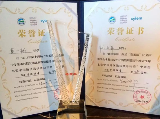 《杭州超限教育中心李林2016年05月31日讯》 2016年5月21日,由环境保护部宣传教育中心,赛莱默(中国)有限公司举办的第十四届“赛莱默”杯全国中学生水科技发明比赛暨斯德哥尔摩青少年水奖中国地区选拔赛总决赛在广东省开平市举行。我校高二(1)班黄一韬,高一(2)班韩之异同学凭借《台州市长潭水库水质锰超标分析研究及对策》的论文以及出色的现场与专家答辩表现,在全国各地前来参赛的选手中脱颖而出,荣获B水资源调查类特等奖。