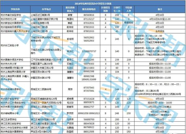 2016年杭州市区民办小学招生计划表