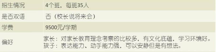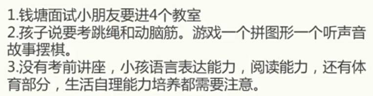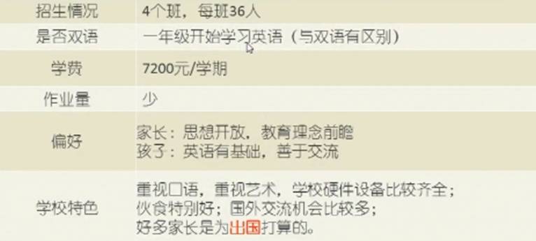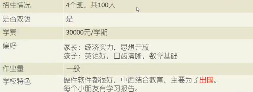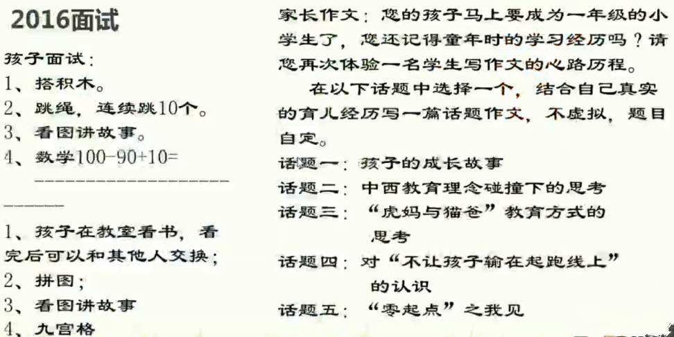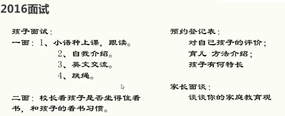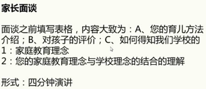 家长访谈部分分为面谈及面试;典型问题——“为什么选择崇文”,“对学费怎么看”,“孩子身上有哪些优点”,“能提供怎样的教育资源和帮助?”