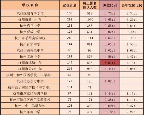 2016年杭州小升初派位报名确认人数为8835人,派位计划人数2537人,下图的2016各个杭州民办初中的派位比例:
