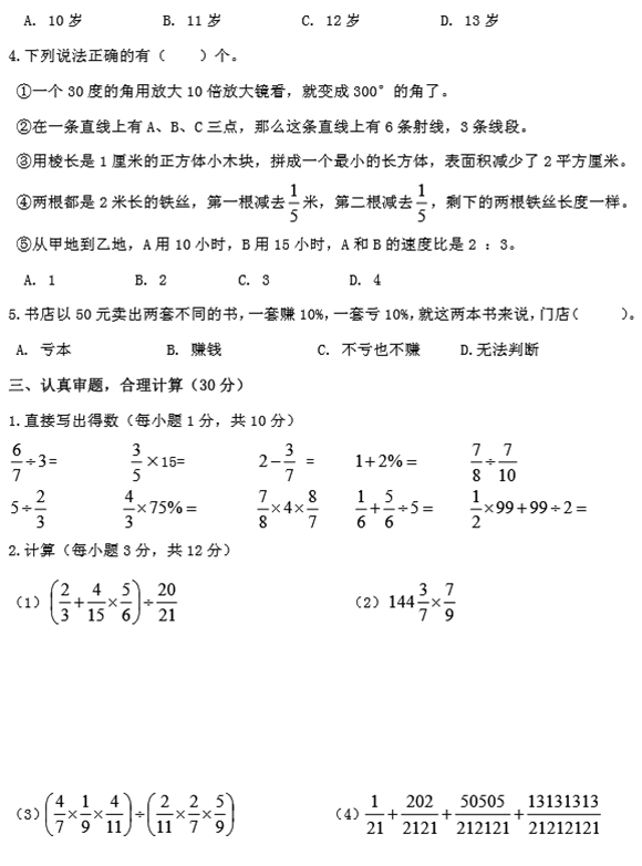 杭州育才中学小升初新生入学考试试题(一)