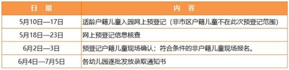 2.符合条件的流动人口随迁子女需提供家庭户口本、父母双方身份证、适龄儿童本人的居住证。适龄儿童本人暂未持有居住证,预计2018年8月底前能取得的,应在报名现场单独登记,待取得居住证后,在2018年8月31日前补交相关材料核验,并由所在区教育局统筹安排入园。
