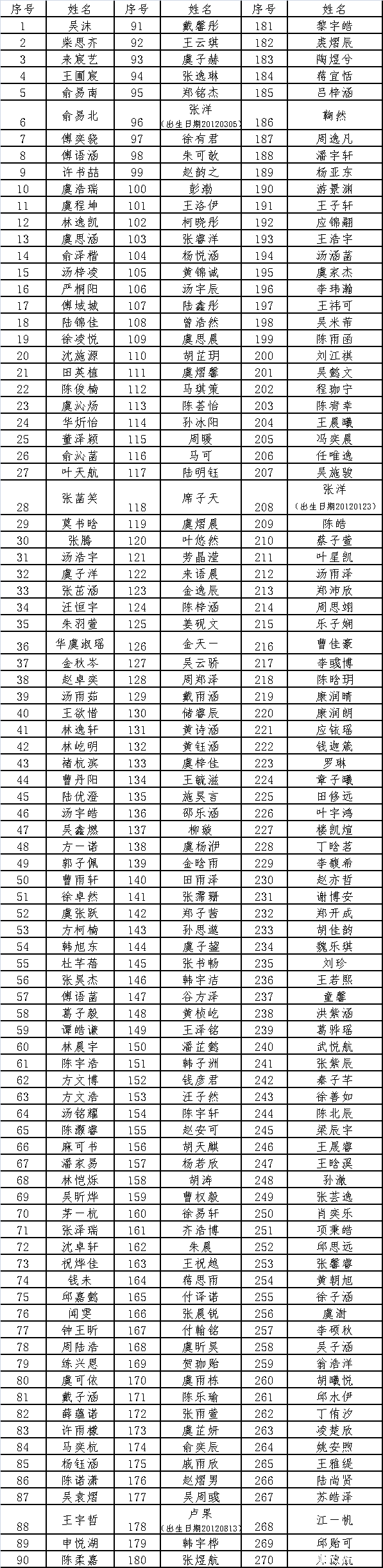 根据滨江区jyj《关于做好2018年公办小学招生工作的通知》(滨教〔2018〕55号),滨文小学(含浙江大学教育学院附属学校校区过渡班级)计划招收11个班,其中滨文小学校区招收6个班。现根据报名情况及家长意愿统计,要求在滨文小学校区就读人数超出计划数。依据《杭州市区义务教育阶段公办学校招生工作暂行办法》(杭教初[2014]13号),滨江区jyj关于招生工作的相关要求和滨文小学2018学年一年级新生招生方案,按录取规则排序,现将安排在滨文小学校区就读学生的拟录取名单公示如下: