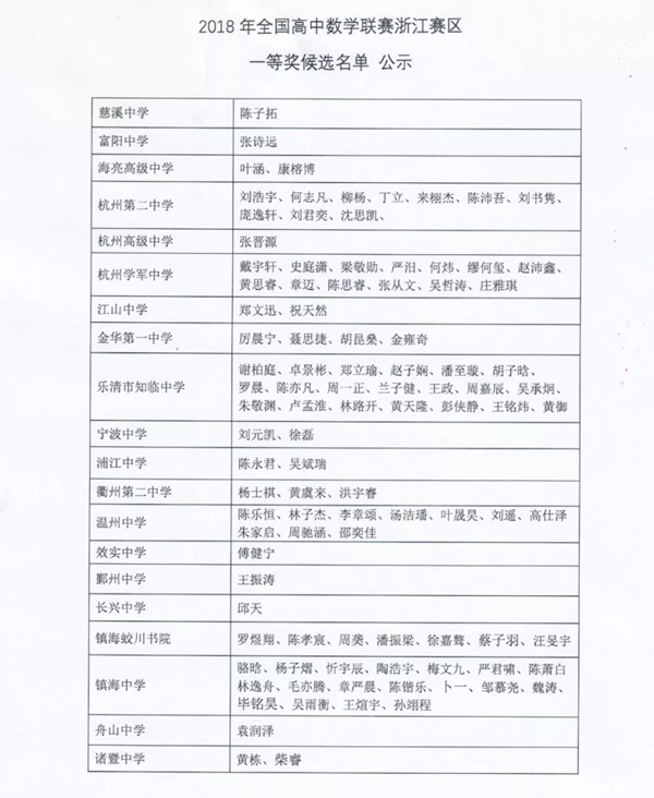 2018年全国高中数学联合竞赛浙江赛区的阅卷工作基本结束.