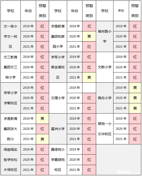 根据往年招生情况以及现掌握的学区内适龄儿童户籍数,对以下学校发布预警信息。