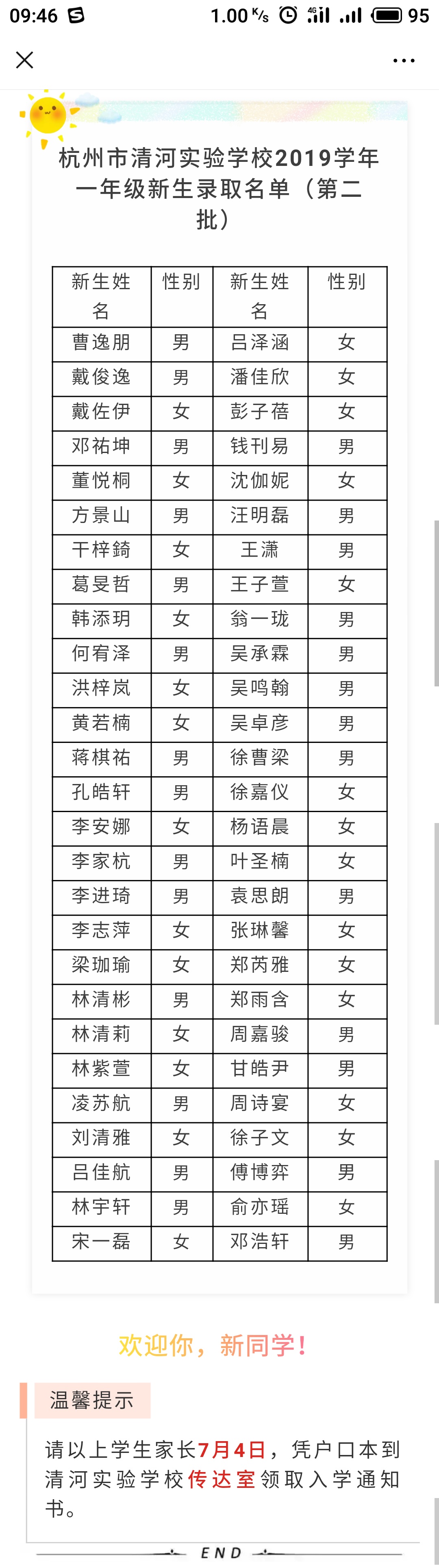 杭州市清河实验学校2019学年一年级新生录取名单(第二批)